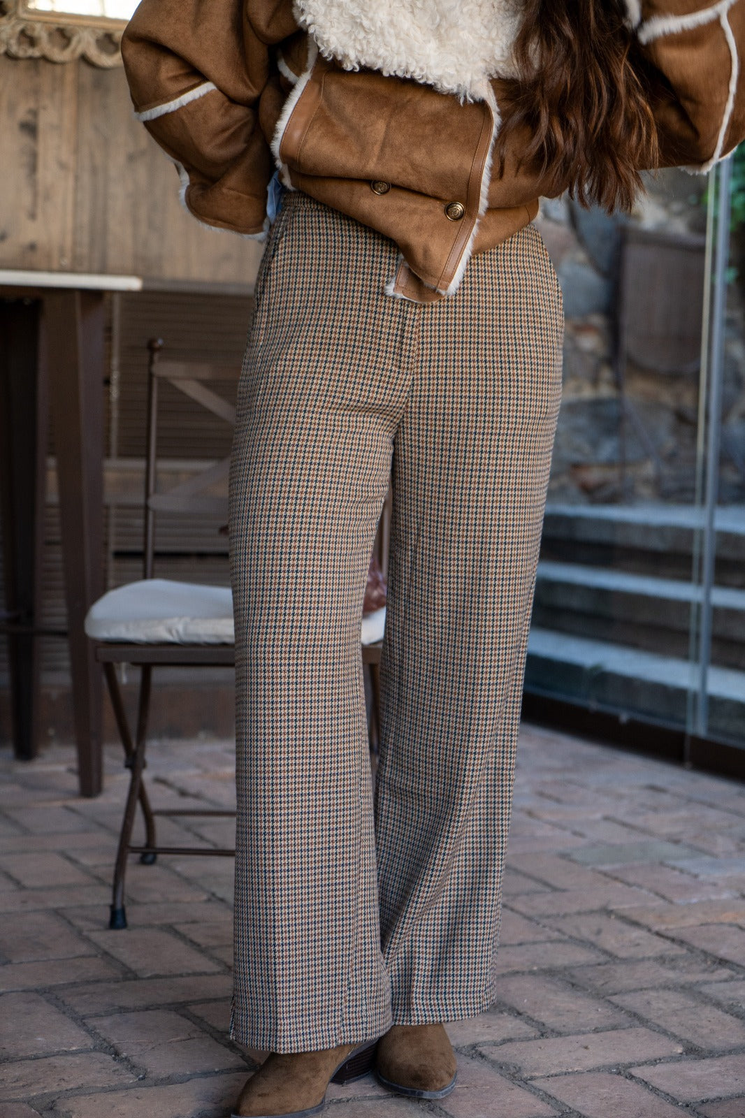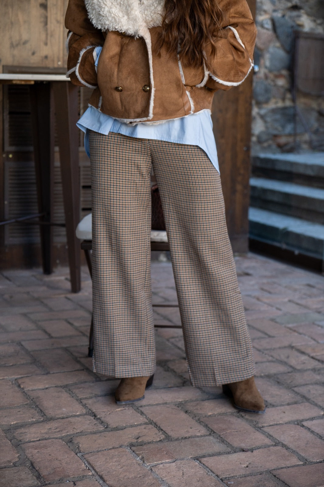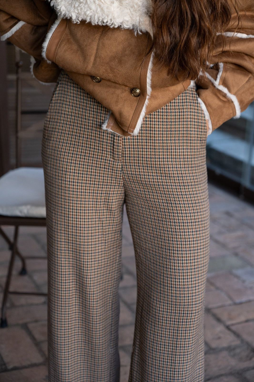 Pantalón en tejido, bolsillos laterales, ancho, estampado pata de gallo.