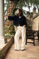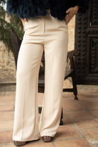 Pantalón tiro alto, bolsillos laterales, ancho, en color beige.