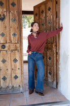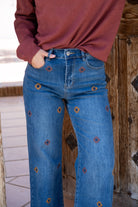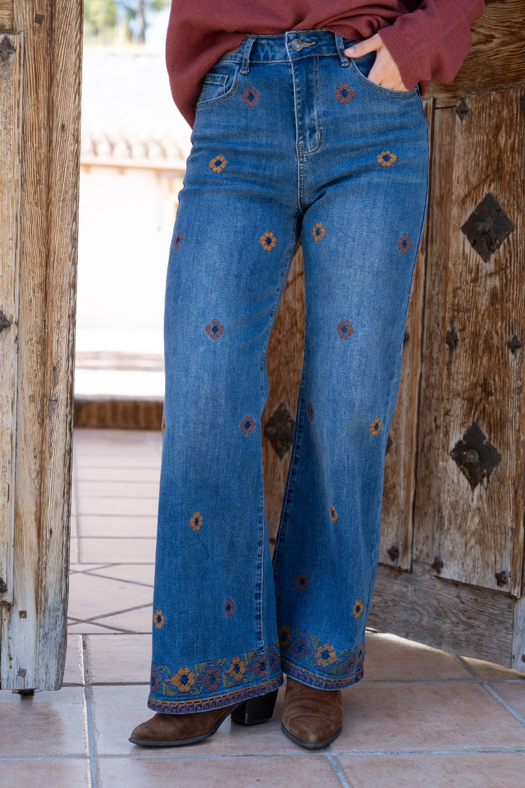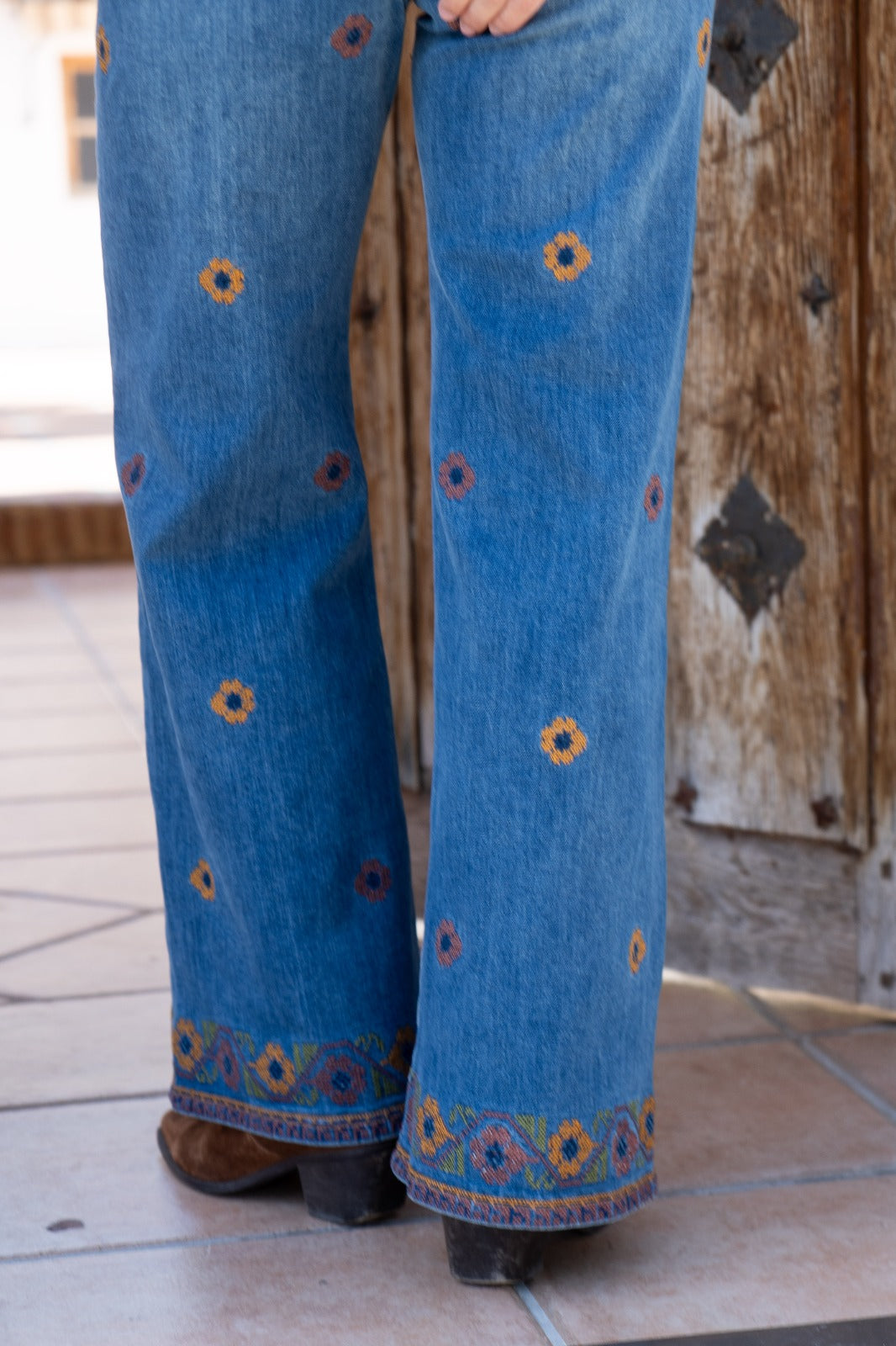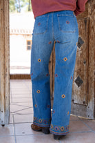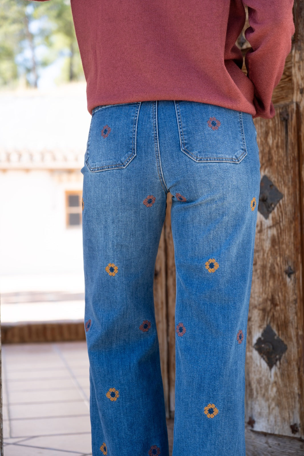 Pantalon vaquero tiro alto, bolsillos trasero y bolsillos delanteros, recto. En color vaquero con detalles bordados.