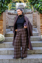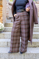 Pantalón en tejido, bolsillos laterales, ancho, en color marrón con cuadros multicolor.