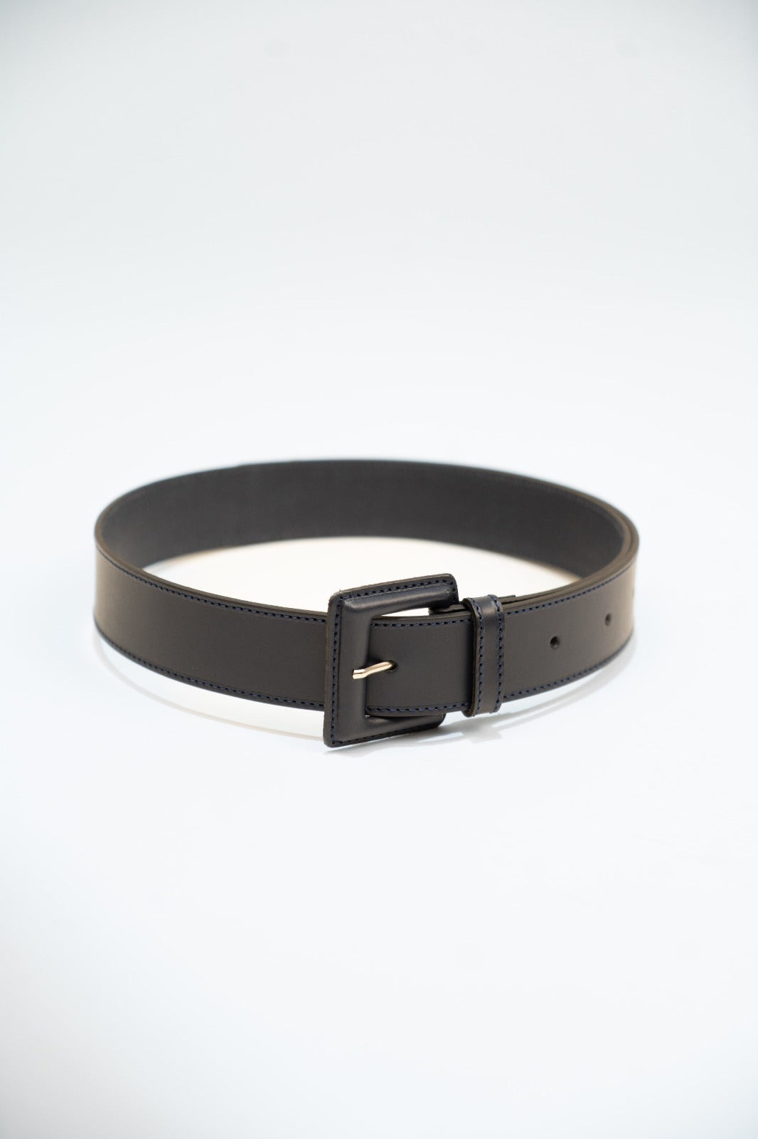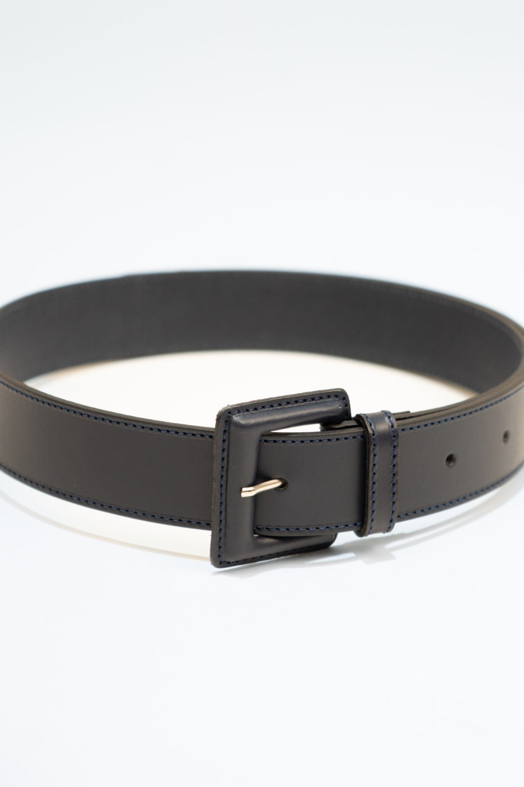 Cinturón confeccionado en piel color marino. Cierre delantero con hebilla forrada en piel.