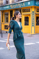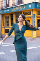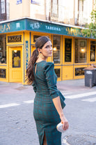 Vestido midi, escote a pico con tul, manga larga, lazo en un lado de la cintura, abertura trasera. En estampado verde y negro.