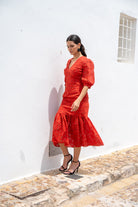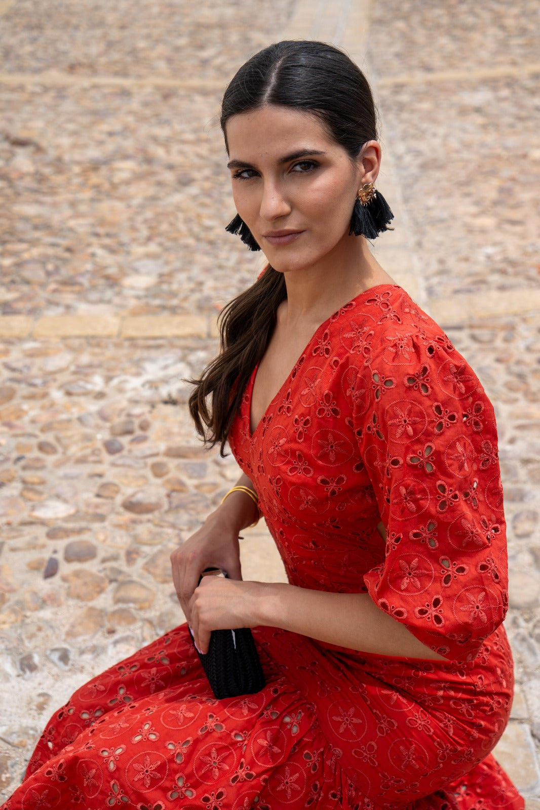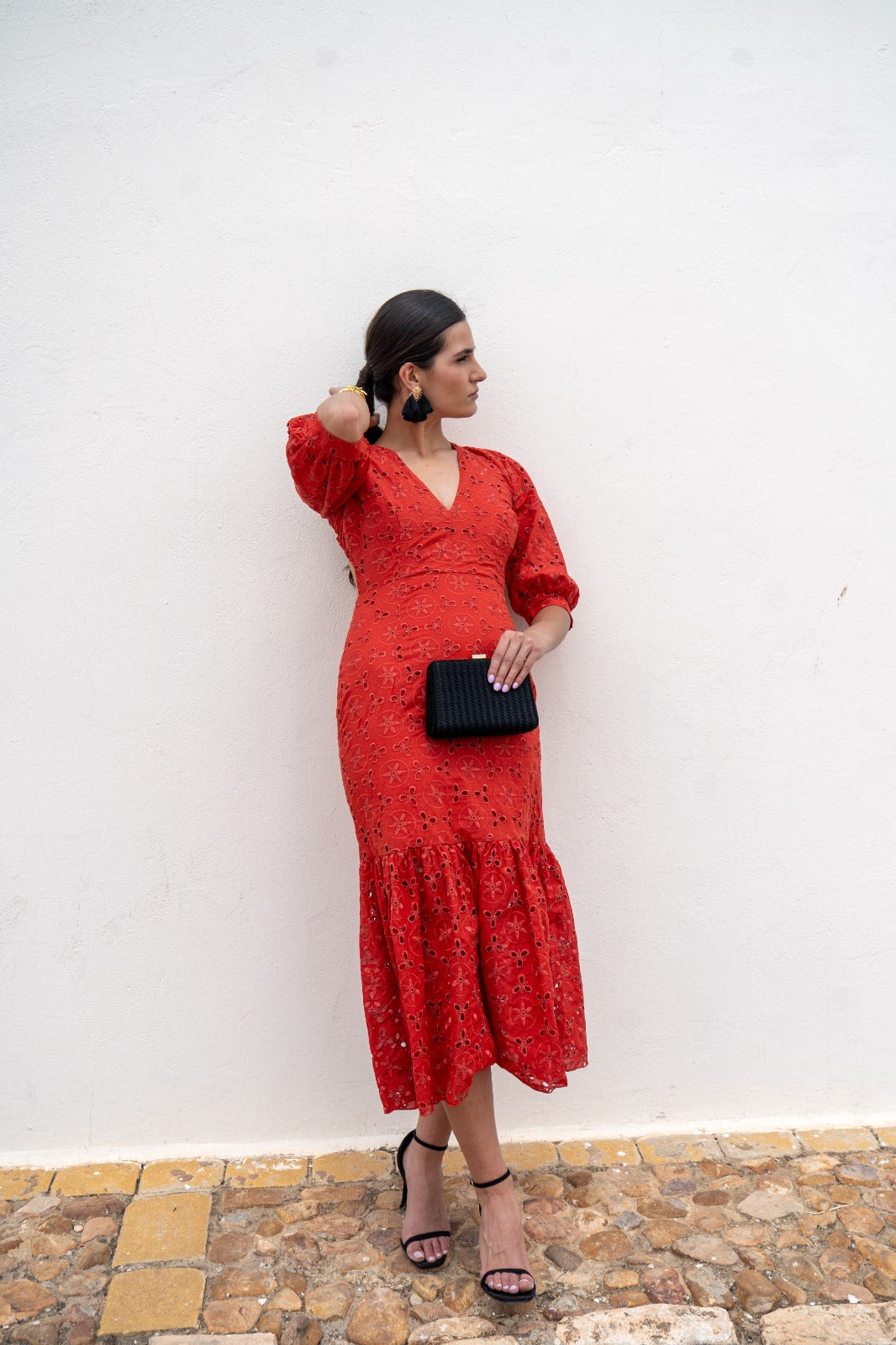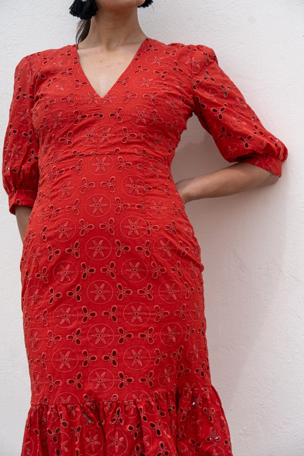 Vestido escote a pico, espalada descubierta, manga corta, volante abajo. Calado y bordado en color caldera.