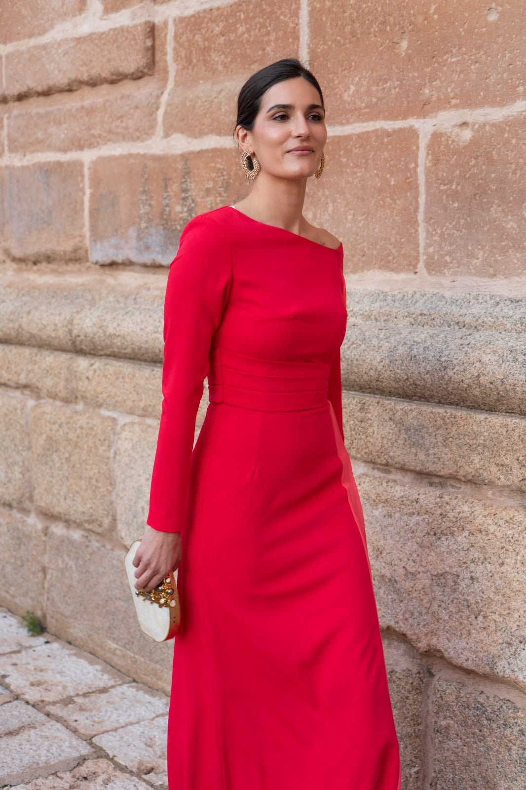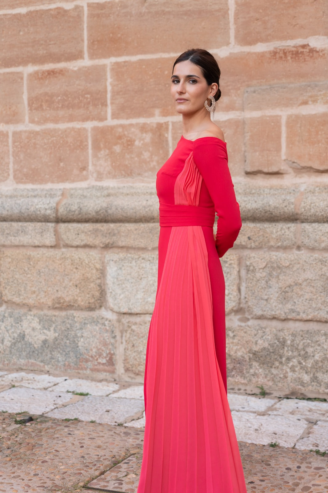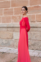 Vestido largo, escote asimétrico, corte en cintura con cinturón, manga larga, caída plisada en un lado. En color frambuesa.
