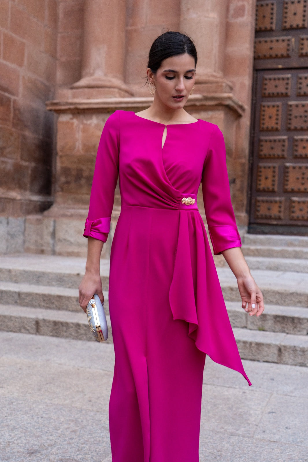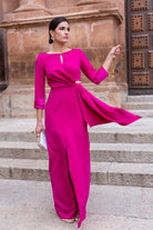 Vestido largo, escote redondo con pequeña abertura, manga francesa con puño en satén, corte en cintura, con caída a un lado. En color fucsia. (Broche de la cintura NO INCLUIDO).