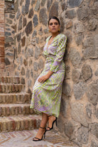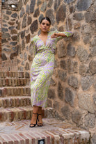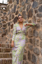 Vestido midi, escote a pico con tul transparente, corte en cintura anudado detras, abertura trasera. En color estampado.