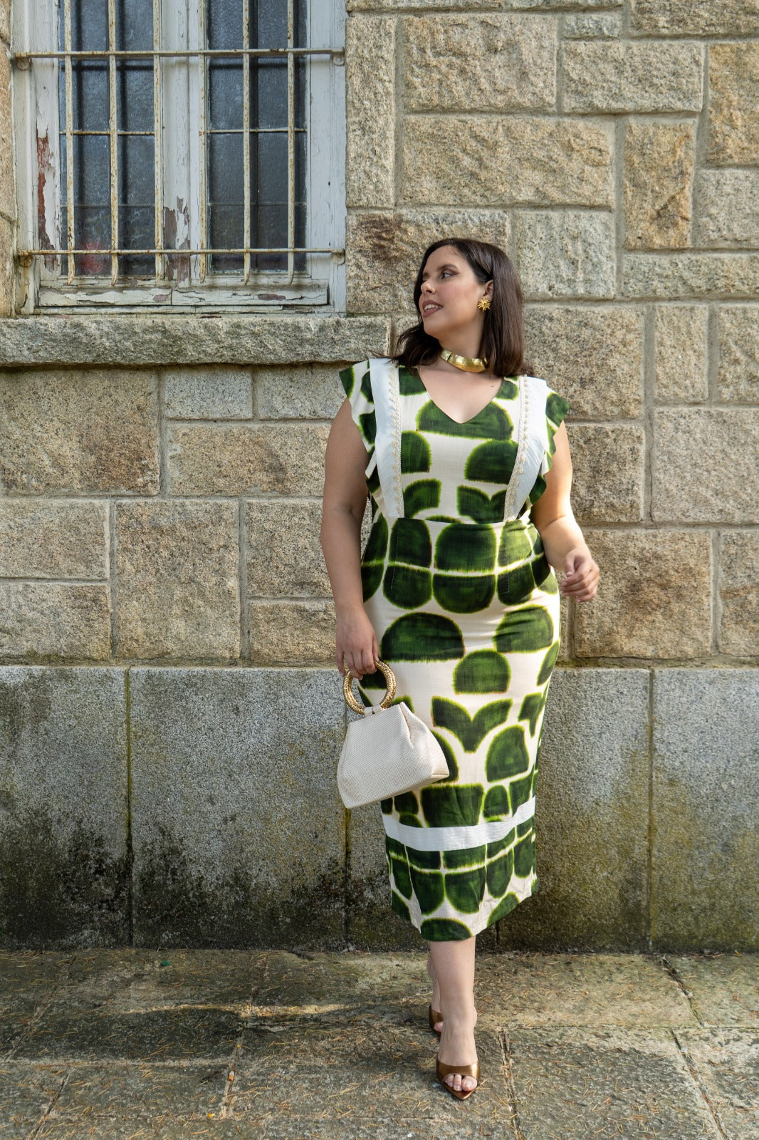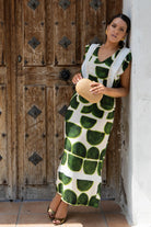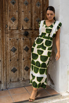 Vestido midi, escote cuadrado, sin mangas con volante, vuelo abajo, abertura trasera. En estampado verde y beige.
