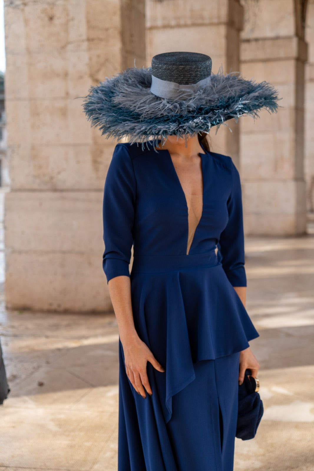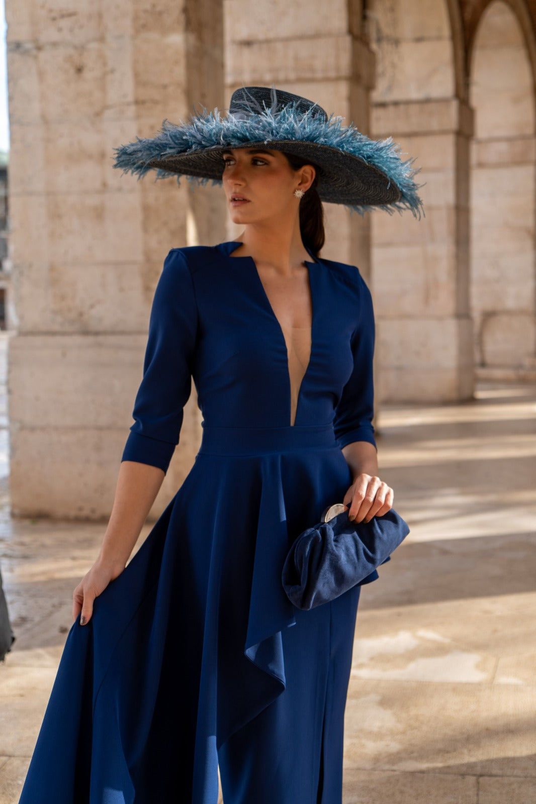 Vestido midi, escote a pico con detalle en el cuello, manga francesa, abertura delantera, sobre falda larga aun lado con peplum. En color azul.