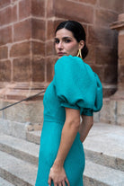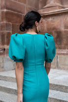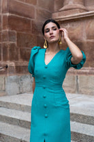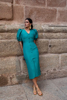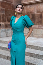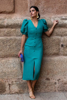 Vestido midi, escote en forma de V, manga corta abullonada, detalle botones delanteros (no se abren), abertura delantera. En color verde.