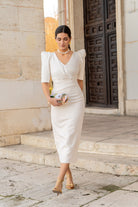 Vestido midi, escote a pico, manga corta y abullonada, combinación de tejidos con corte en cintura. En color beige con lurex dorado.