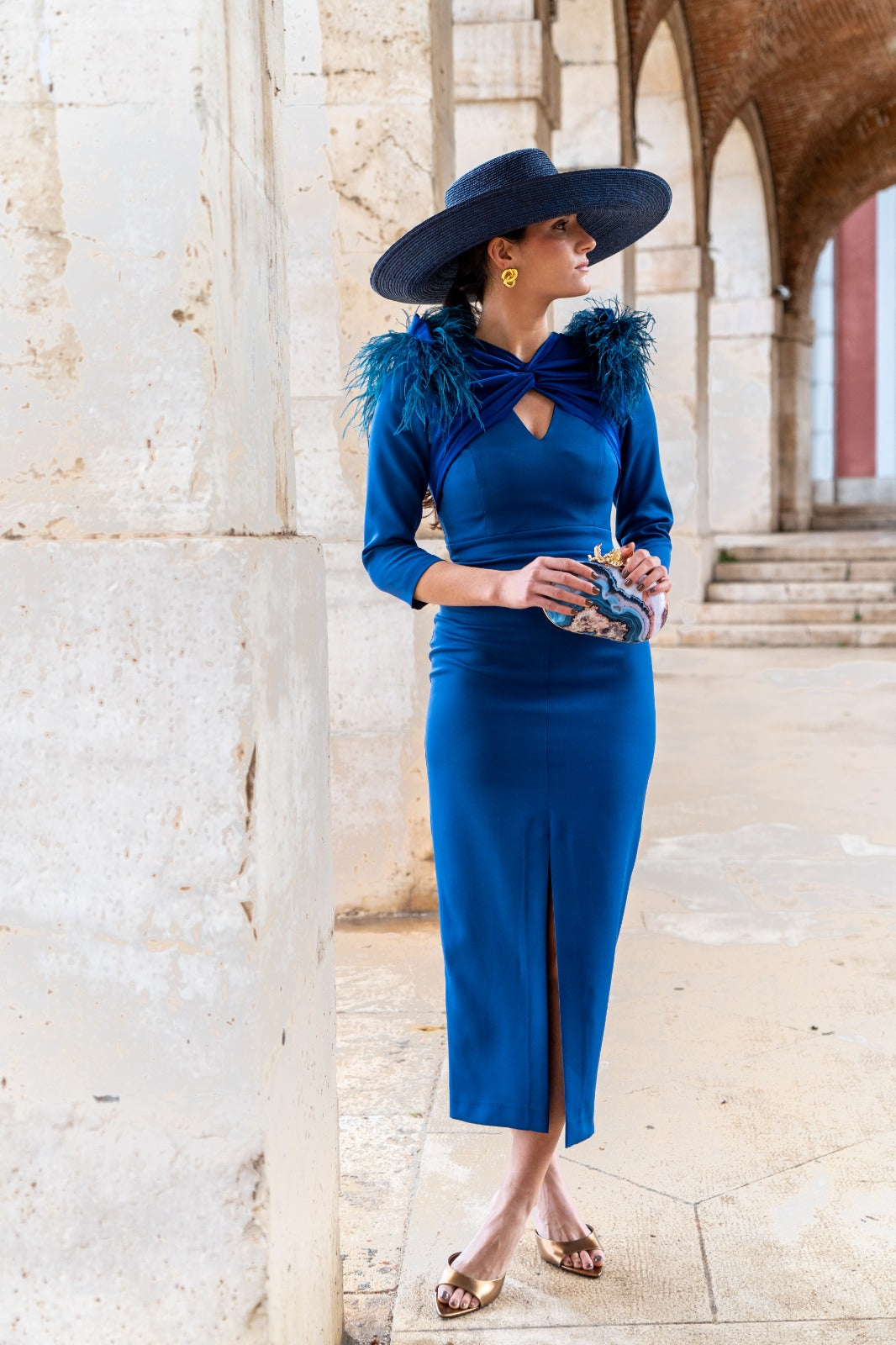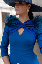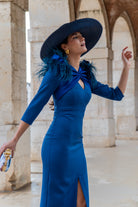 Vestido midi, manga francesa, escote con nudo y lagrima, detalle plumas en hombros, abertura delantera. En color azul.