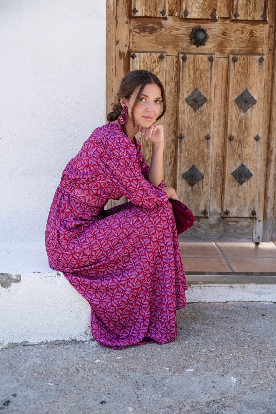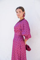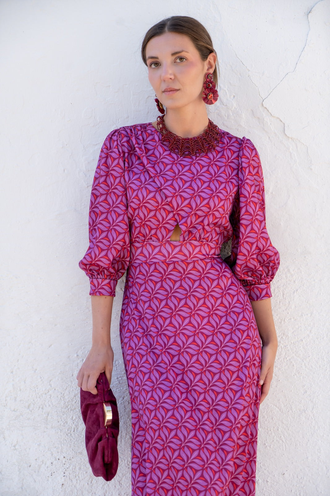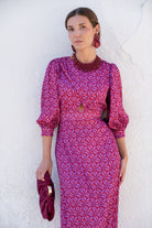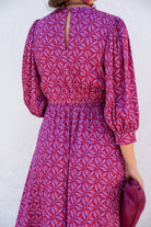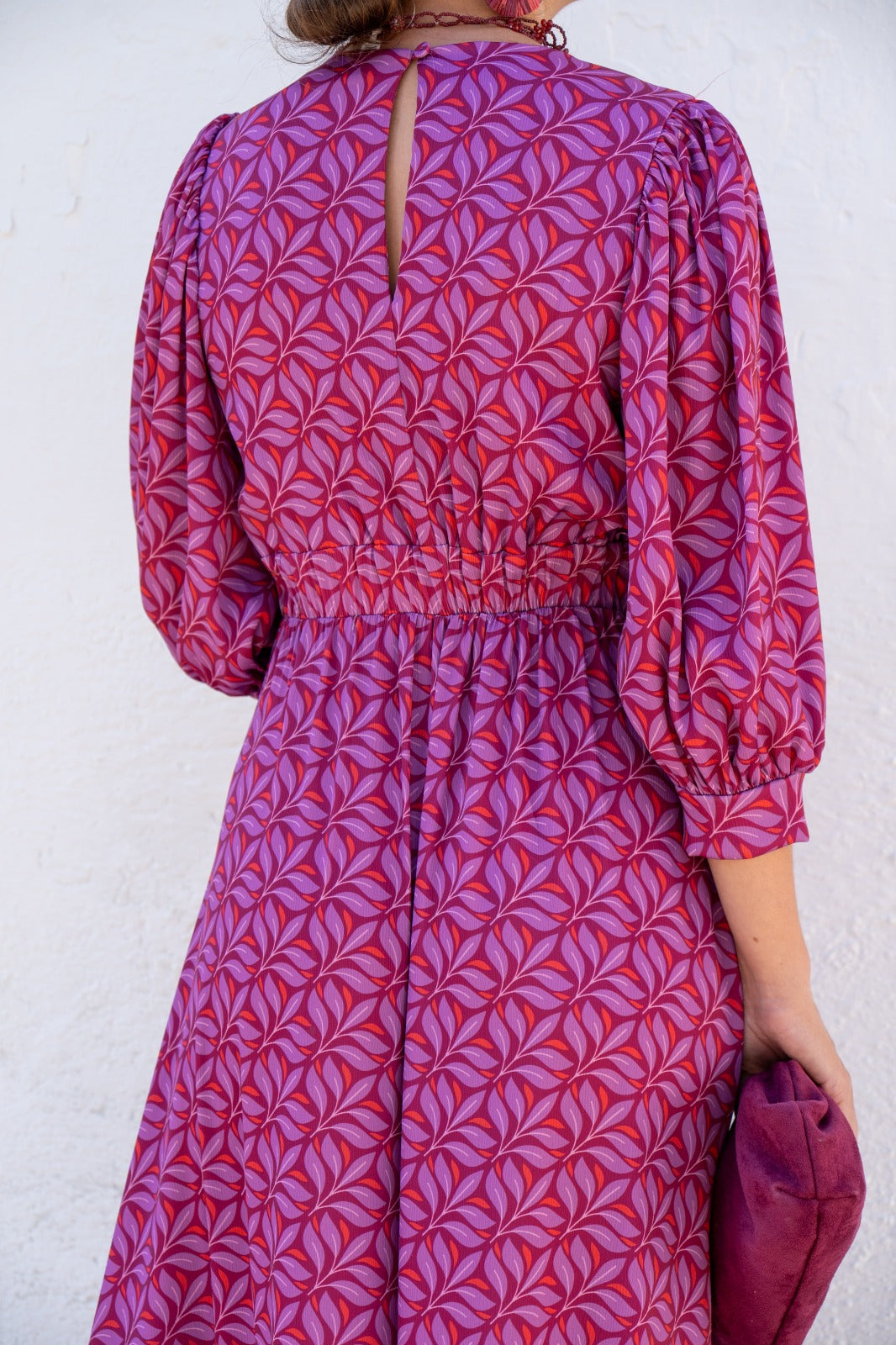 Vestido midi, escote redondo, manga francesa con puño, cut out delantero, goma en cintura trasera, falda evase. Estampado en tonos morados.