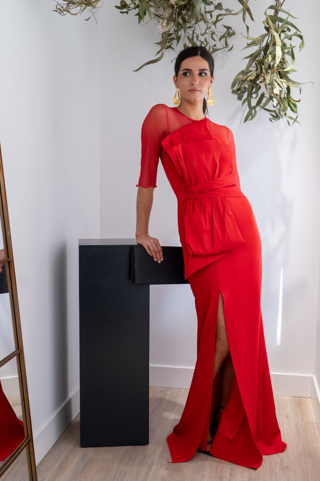Vestido largo, escote redondo, parte de arriba en gasa, detalle lazo tafetán en la parte delantera, abertura delantera a un lado, En color rojo.