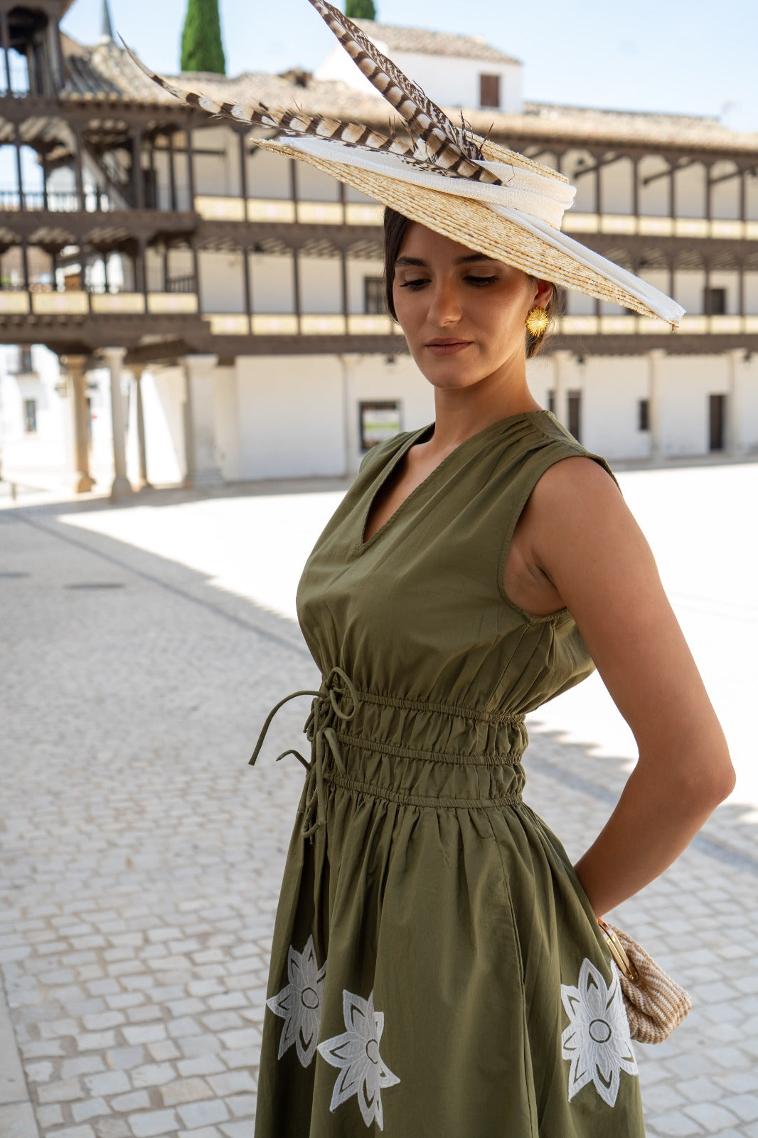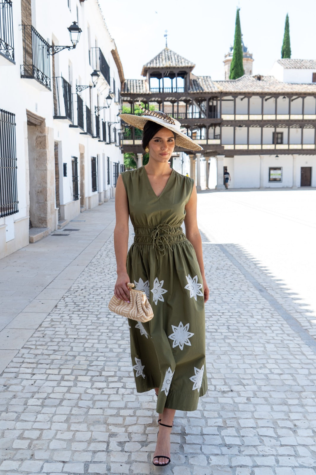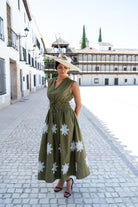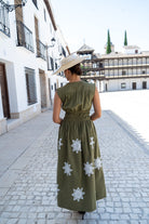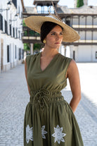 Vestido escote a pico, sin mangas, corte en cintura engomado, falda globo. En color verde con bordado blanco.
