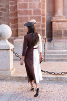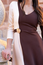 Vestido midi, escote pico, media manga, corte en cintura detalle dorado, evase, falda con movimiento. Bicolor beige y marrón.