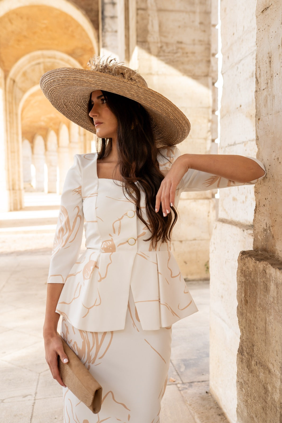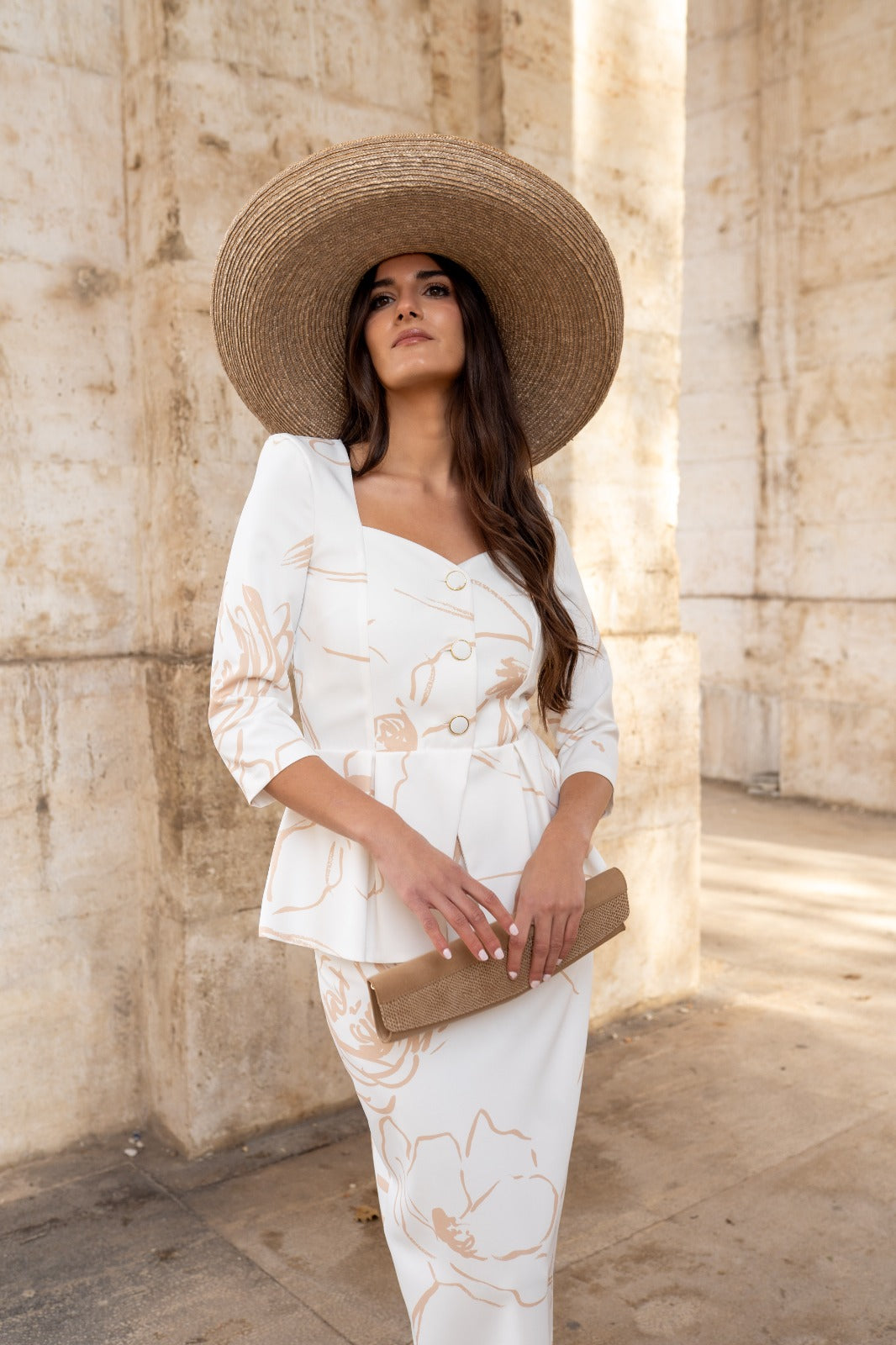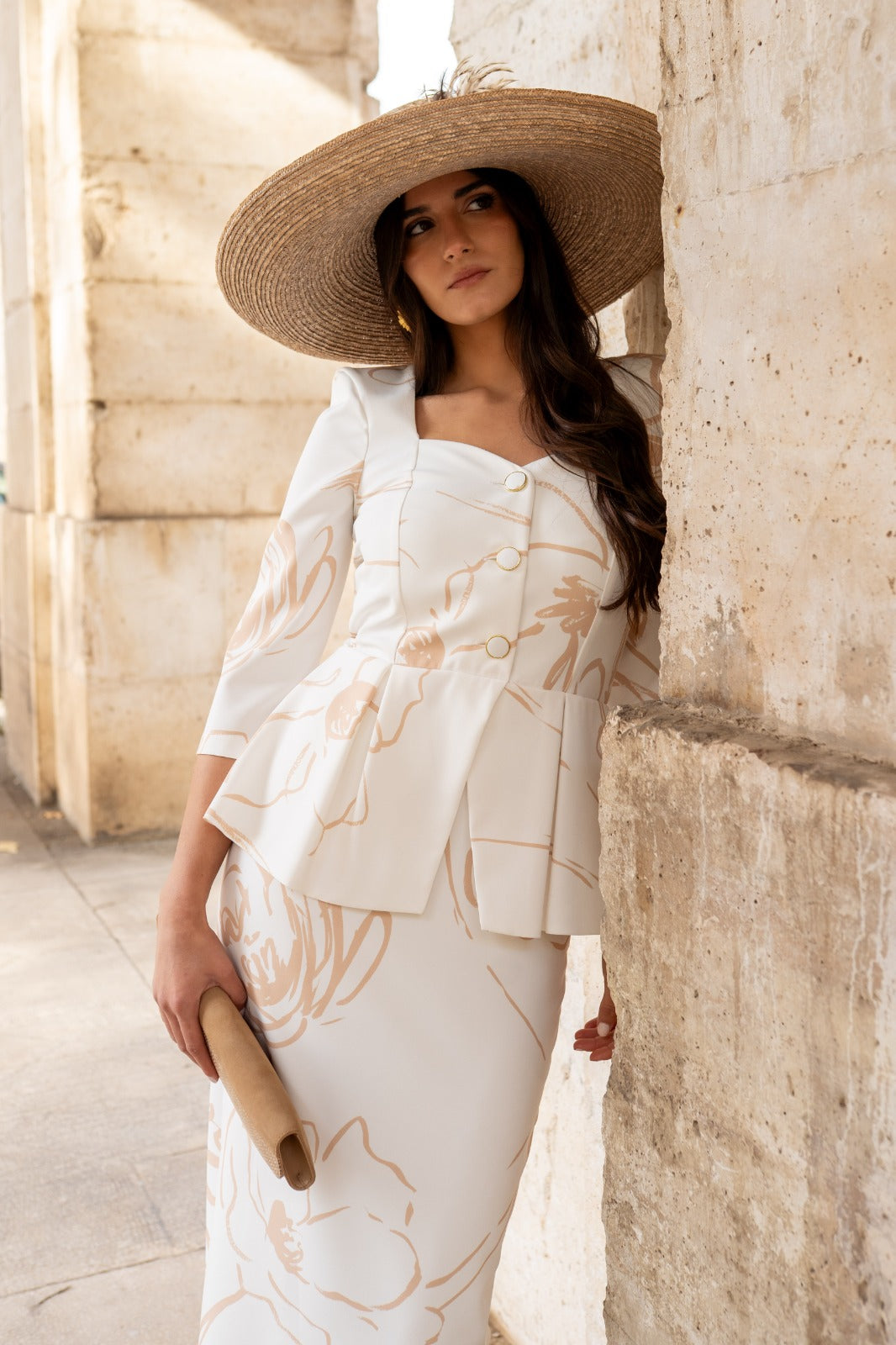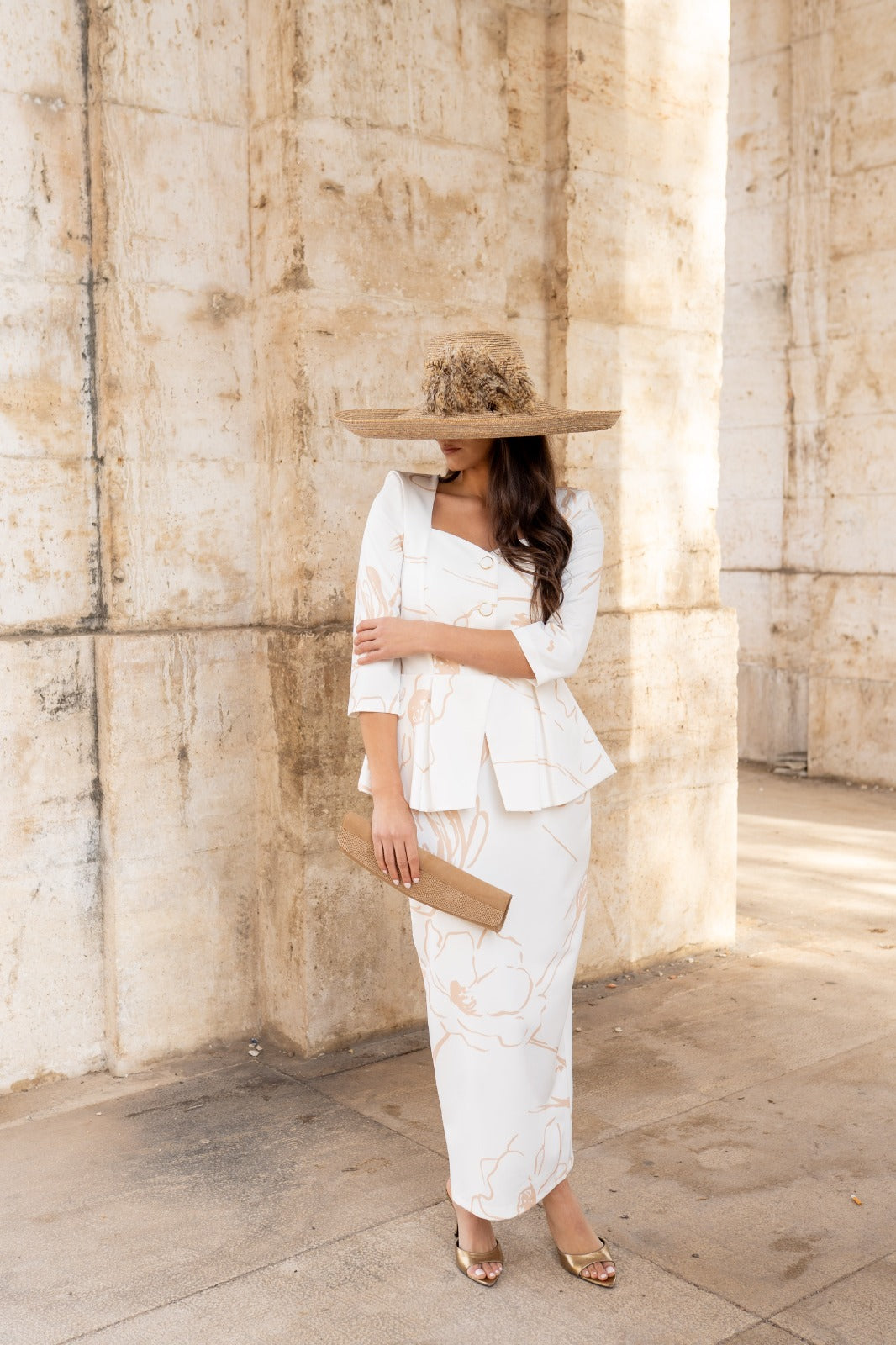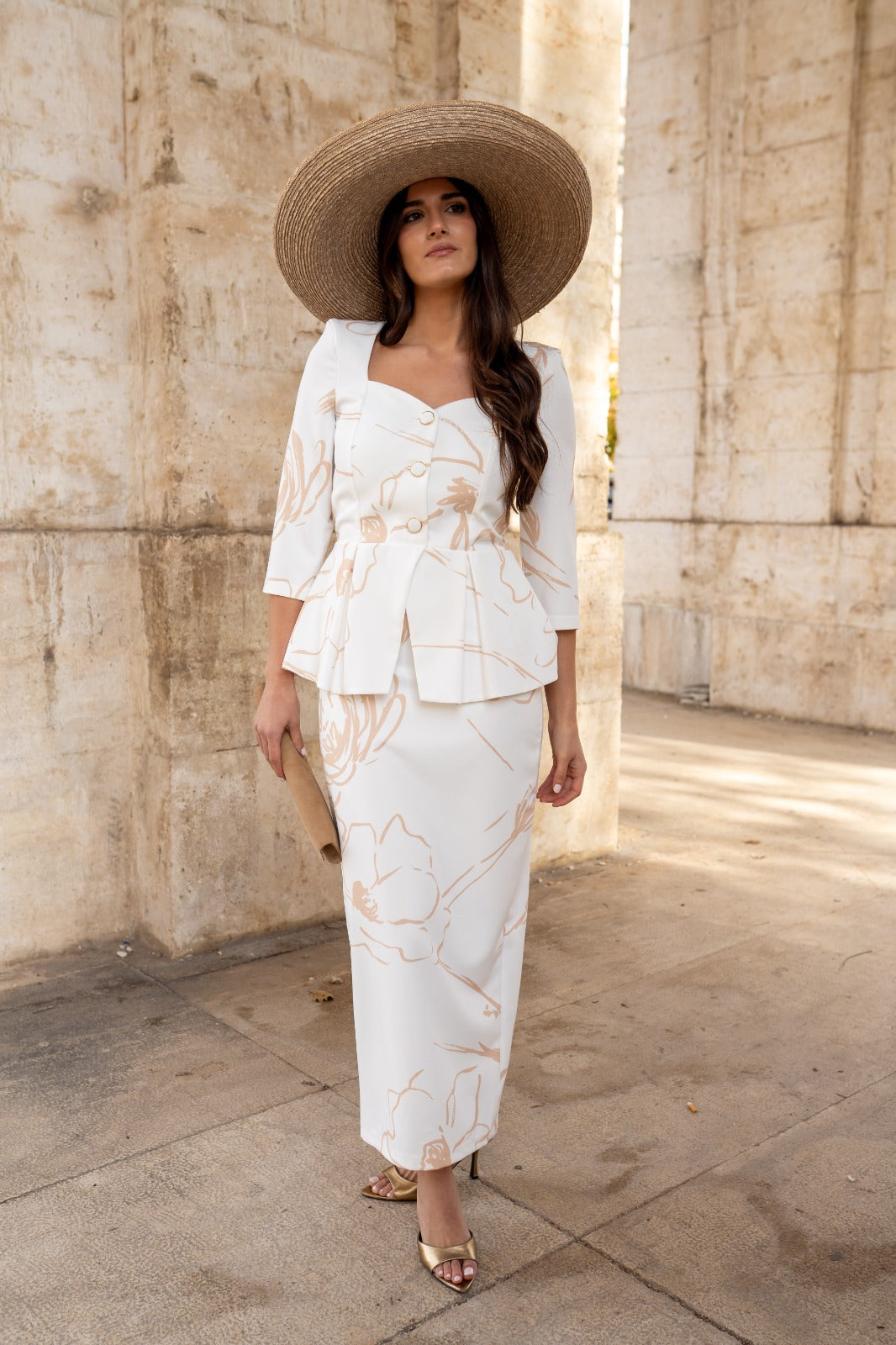 Vestido maxi midi, escote corazón, manga francesa, peplum en cintura, abotonado, abertura trasera. En color blanco con estampado camel.
