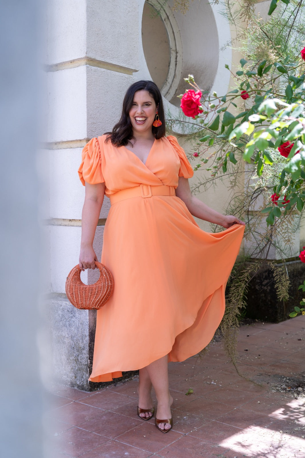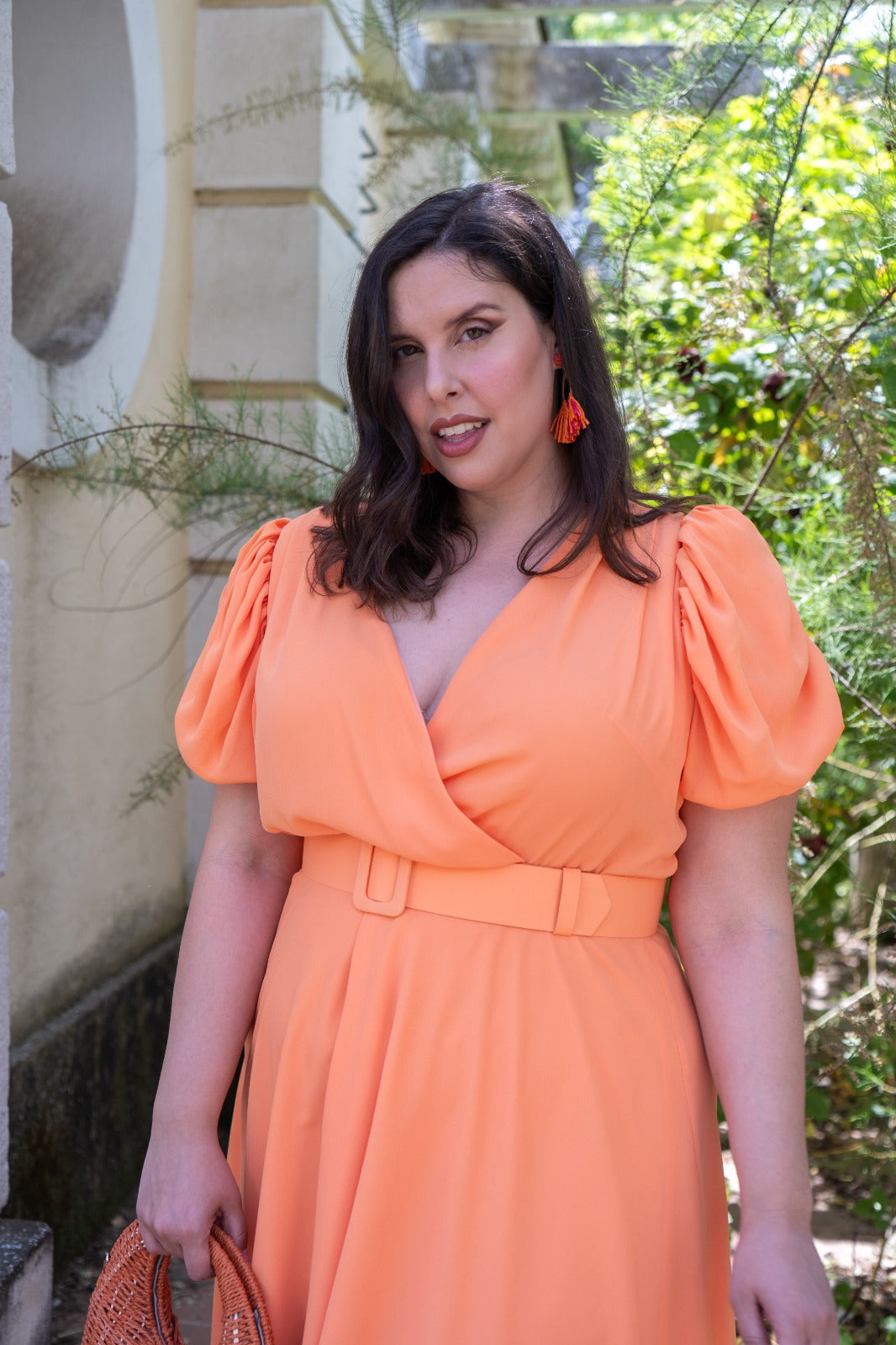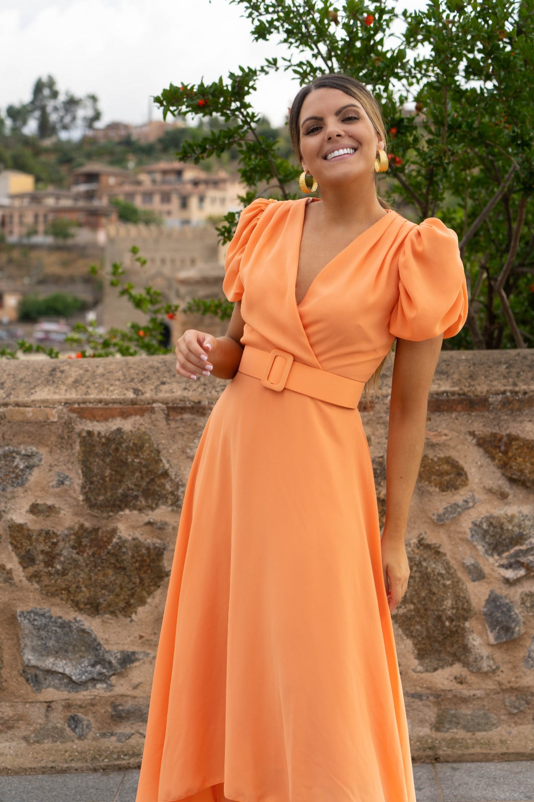 Vestido midi, escote cruzado, manga corta abullonada, falda con vuelo, cinturon incluido. En color coral.
