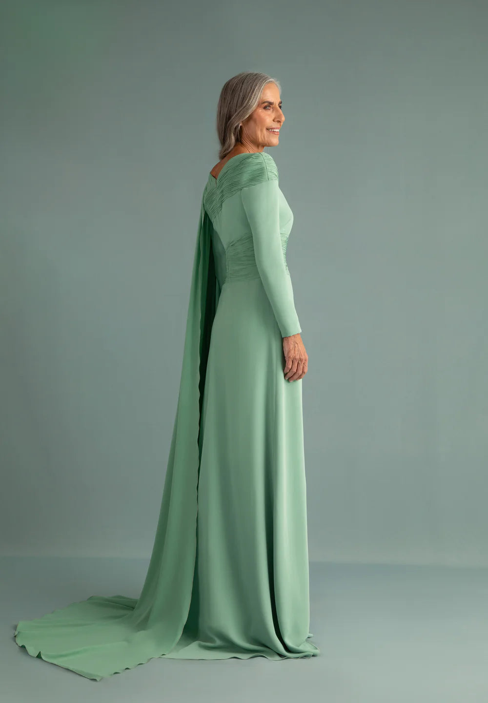 Vestido en crepé con manga larga y escote asimétrico que lo recorre piezas de georgette drapeadas a mano, al igual que la pieza diagonal que envuelve la cintura. Capa de georgette que nace del hombro izquierdo y cae hacia el suelo. En color azul ultramar.